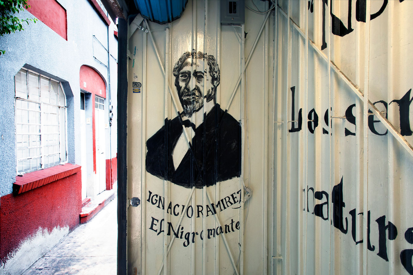 “God Does Not Exist”, a project carried out in collaboration with Vicente Razo. D.N.E. consisted of rewriting one of the most famous slogans inscribed by muralism: the phrase “God Does Not Exist” that Diego Rivera painted in 1947 in homage to Ignacio Ramirez “El Nigromante” in the mural Sueño de una tarde dominical en la Alameda (Dream of a Sunday Afternoon in the Alameda).